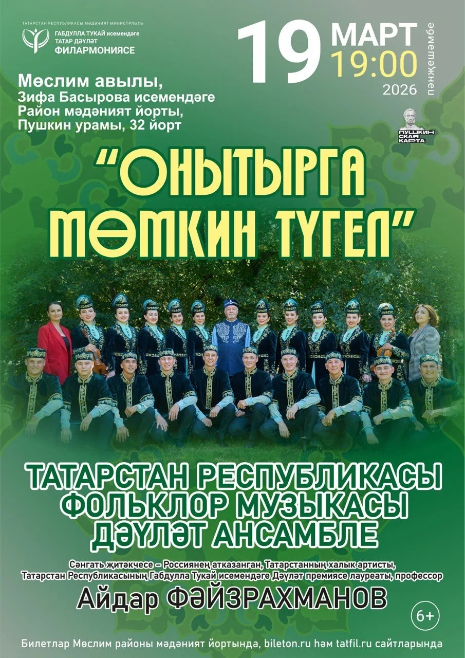 19 нчы март 2026 ел. Билет бәясе 1000 сум. 19:00 сәг.