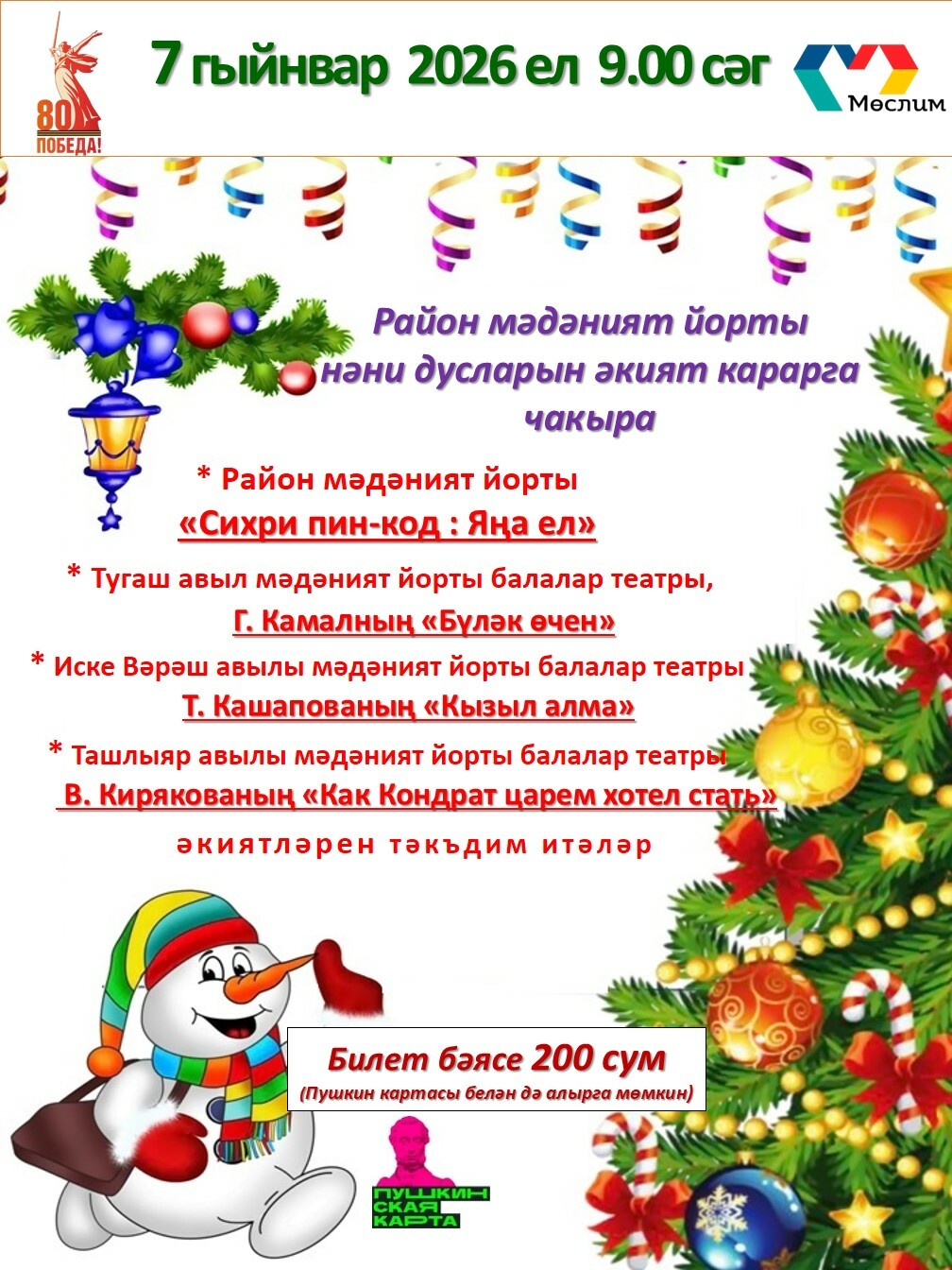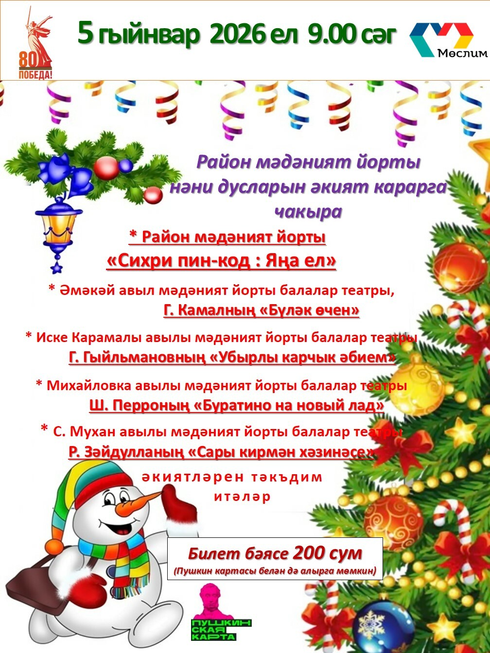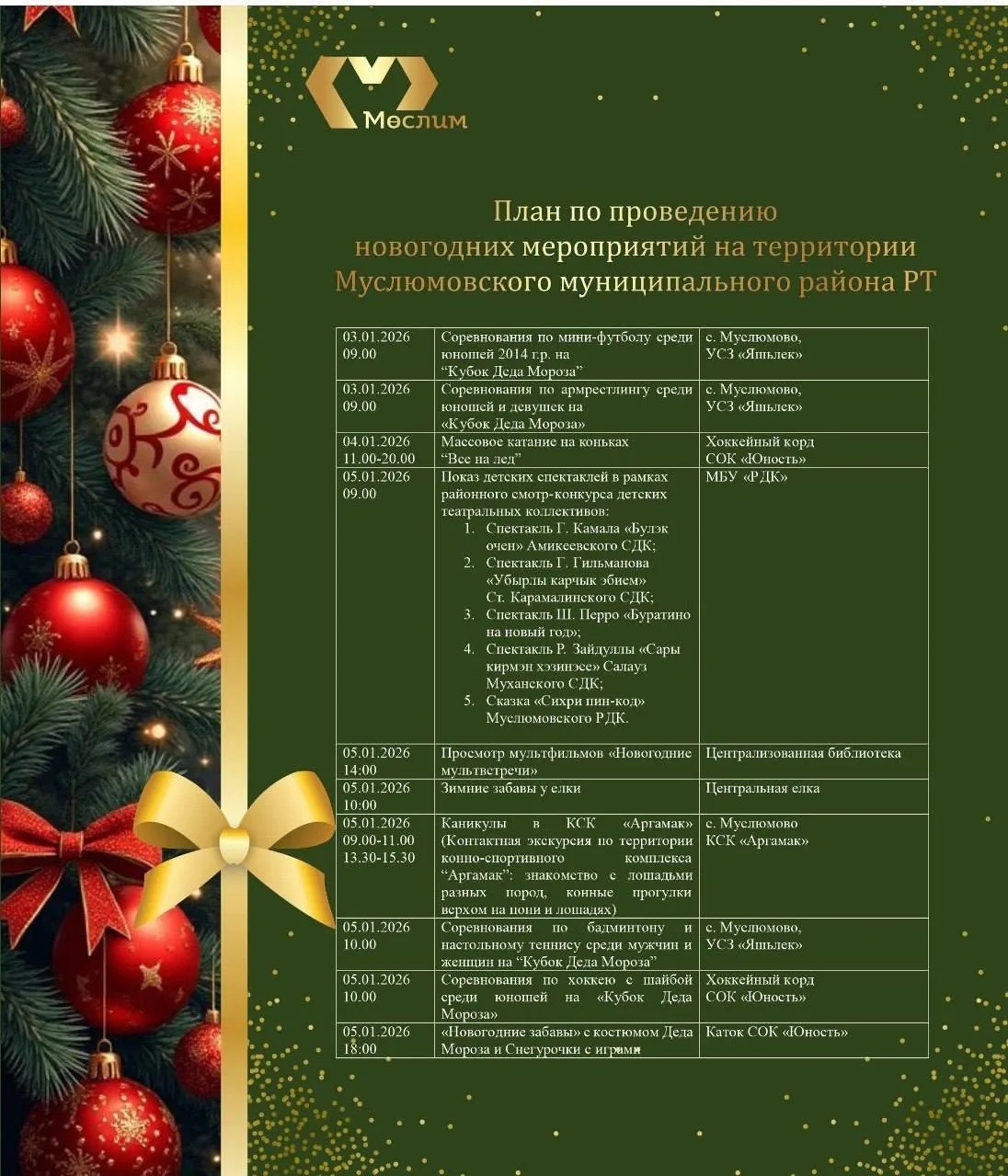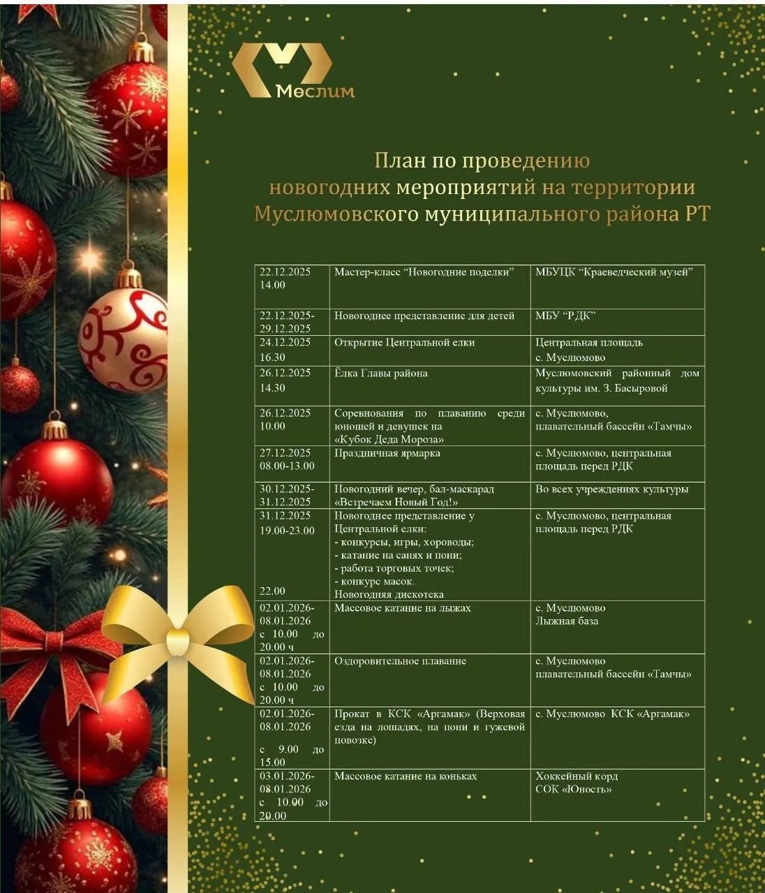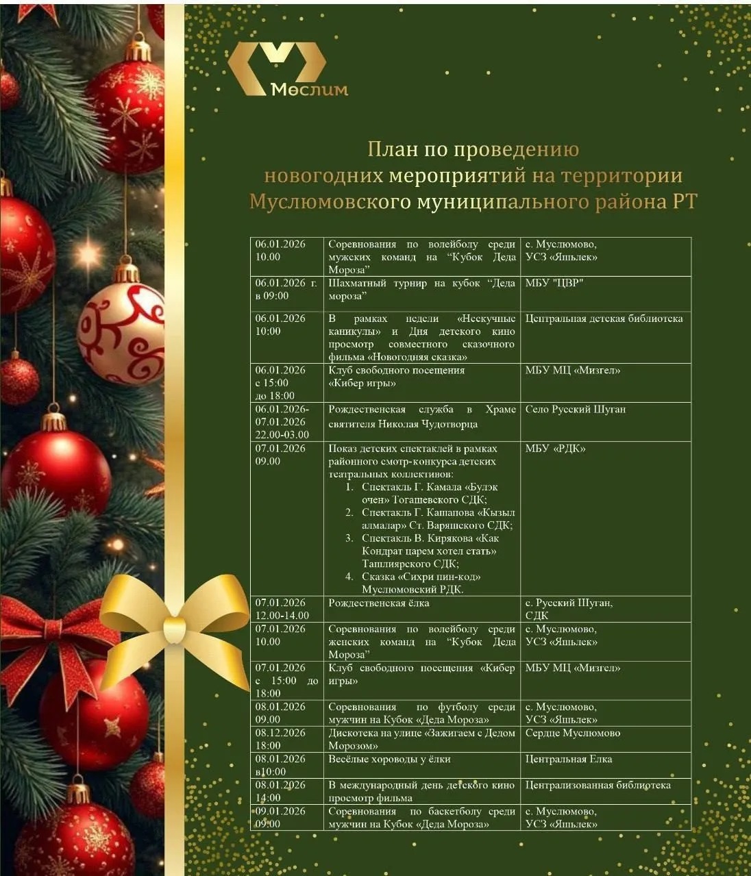 🎄☃️ Яңа ел бәйрәмнәре чорында районыбыз күңелле, кызыклы һәм истәлекле чараларга бай булачак! Барлык яшьтәге райондашларыбыз һәм Мөслимебез кунаклары өчен күңел ачу программалары әзерләнде, тулырак – афишада. Бәйрәмнәрдә актив катнашыйк, бергә булыйк! 😉